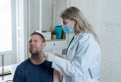 Doctor testing scared adult man for coronavirus infection performing nasal swab, PCR COVID-19 test