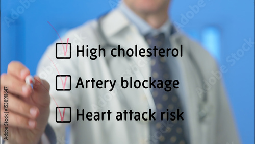 Doctor ticking checkboxes of high cholesterol, artery blockage and heart attack risk factors, highlighting the interconnectedness of these cardiovascular health issues