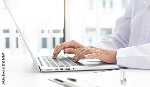Doctor uses a laptop computer to record patient information and write it on a document to prepare for diagnosis in the room of a modern hospital, Emergency assistance and health care concept.