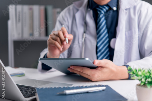 Doctor uses tablet with stylus in clinic office for medical record ehealth telemedicine patient management healthcare technology workflow data entry modern hospital concept.