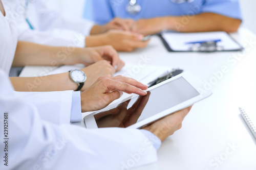 Doctor using tablet computer at medical meeting, closeup. Group of colleagues at the background