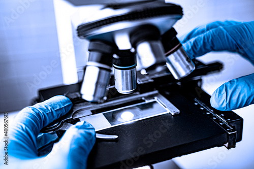 doctor wearing protective gloves using microscope researching corona virus microscopic cells testing vaccination cure, medical center lab china Wuhan world health organization research facilities