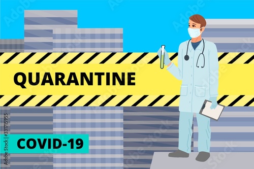 Doctor with a medical test tube against the backdrop of the city. Title Quarantine, vaccine research, population testing. Vector illustration