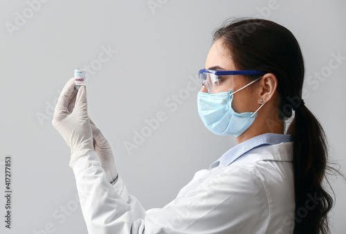 Doctor with vaccine against COVID-19 on grey background