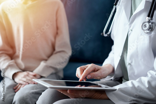 Doctor woman and kid boy patient at home. The pediatrician using tablet computer while filling up medical records, close up. Medicine, healthcare concept