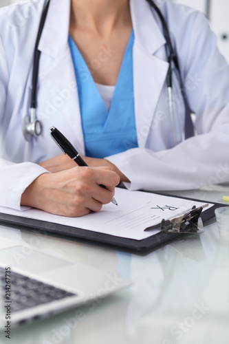 Doctor woman filling up prescription, close-up of hands. Physician at work. Medicine and healthcare concept