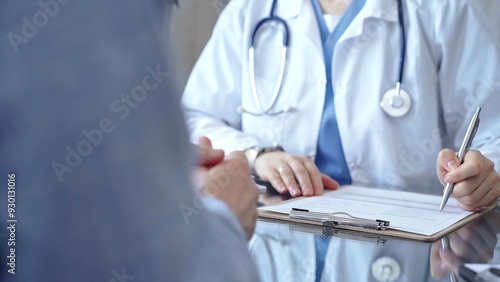 Doctor woman is writing something while consulting man patient on the glass desk and a clipboard in medical office. Medicine concept