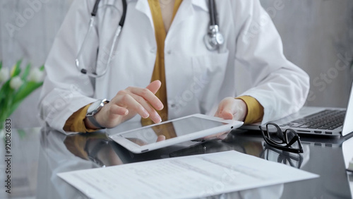Doctor woman using tablet on the glass desk in medical office. Medicine and health care