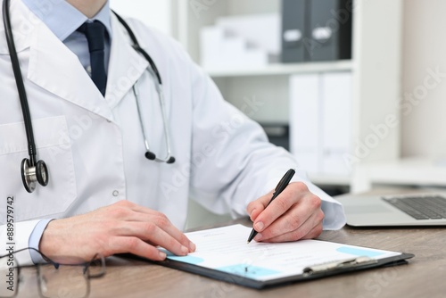 Doctor writing prescription at wooden table in clinic, closeup