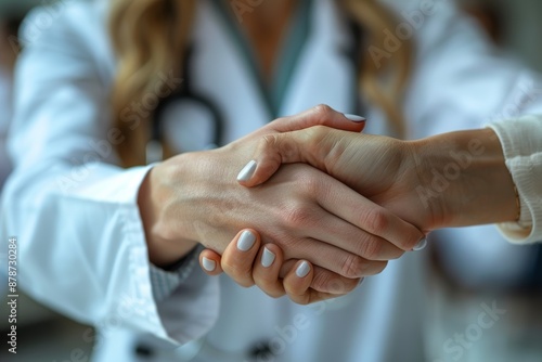 Doctors and patient shaking hands in hospital, symbolizing trust and care