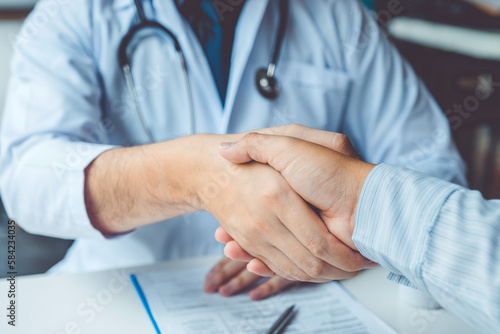 Doctors and patients consulting and diagnostic examining sit and talk. At the table near the window in the hospital medicine concept