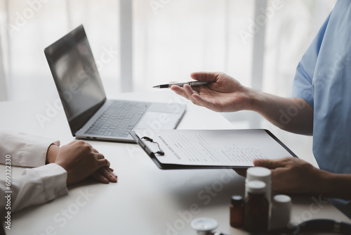 Doctors are giving advice on treatment to patients in hospital examination rooms, treating diseases from specialists and providing targeted treatment. Concepts of medical treatment and specialists.