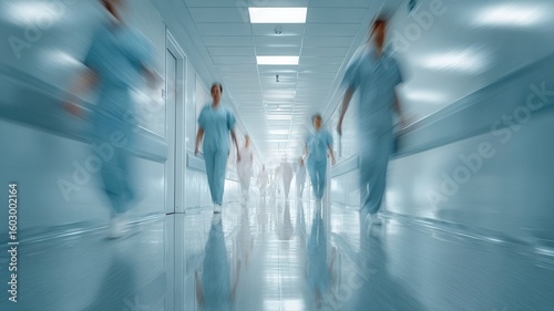 Doctors corridor, nurses rushing through a busy hospital and focused on saving lives with urgency and teamwork