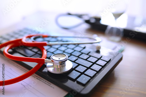 Doctor`s desk in the clinic's office. Stethoscope, test tubes, laptop, prescriptions on the table.