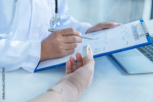 Doctors hand holding pen and report health examination results, recommend medication to patients in arm accident