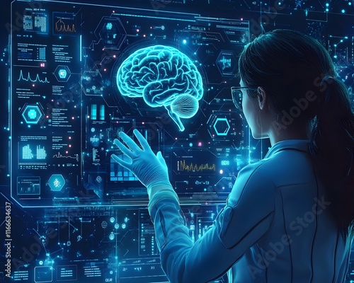 doctor's hand touching a blue digital infographic wall of brain health activities, symbolizing AI’s integration and analysis capabilities in healthcare.