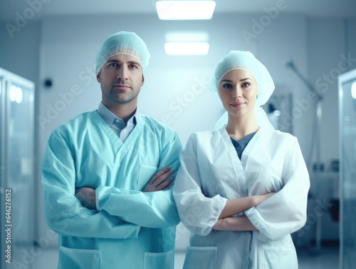 Doctors radiate professionalism and positivity as they confidently stand with crossed arms in a hospital, smiling warmly while looking at the camera.