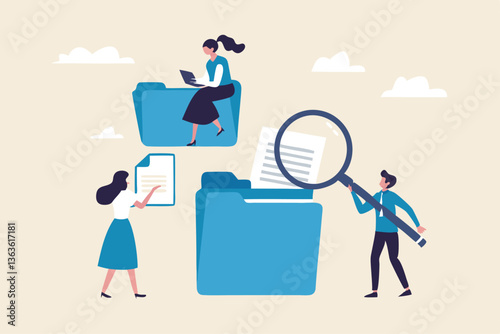 Document, content or research paper, documentation file folder storage, report or paperwork, search or file archive, office contract concept, business people working with paper document file folder.