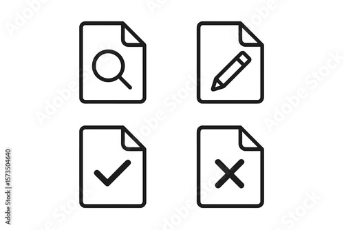 Document Icons Set. Paper Symbol with Magnifying Glass, Pencil, Check Mark, Cross. File Status, Edit, Approve, Reject. Outline Vector Illustration. Office, Business, Web, App, UI Design.