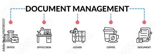 DOCUMENT MANAGEMENT web banner icons collection. Containing icon of office, office desk, locker, coffee, and document. For sign, symbol, presentation, infographics, or web graphics
