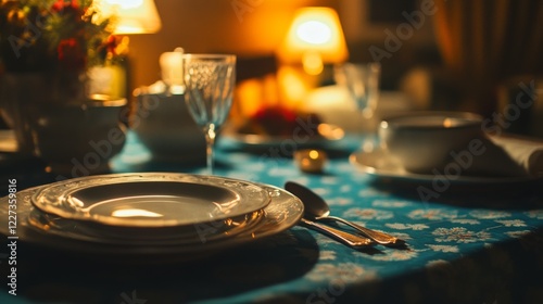 Documentary style photograph capturing solitary dinner scene, traditional holiday feast plating, blue patterned tablecloth, warm golden bokeh accents, rustic ceramic dishes, melancholic atmosphere,