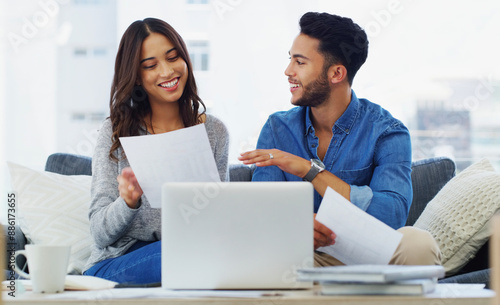 Documents, insurance and laptop with couple on sofa in living room of home for bank payment. Computer, mortgage or paper with man and woman in apartment to review accounting, finance or taxes