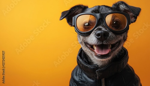 Dog in biker gear with goggles, happy expression, orange background, studio lighting