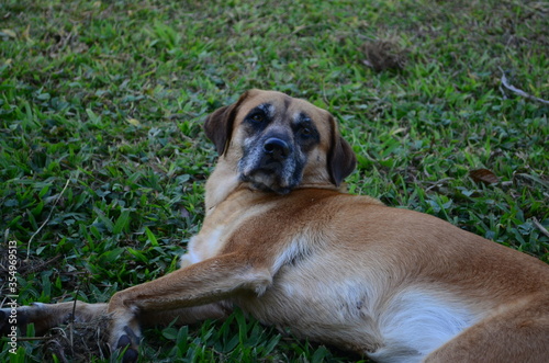 Dog laying outside at sunset. Low exposure photo of belgian shepherd. Dog laying in the grass relaxing.
