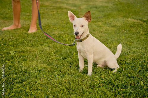 Dog Parson Russell Terrier breed is playing in green park with his owner. Summer time or beginning of autumn. Nature. Pet care and training concept.