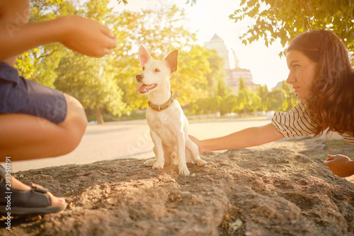 Dog Parson Russell Terrier breed is playing in green park with his owner. Summer time or beginning of autumn. Nature. Pet care and training concept.