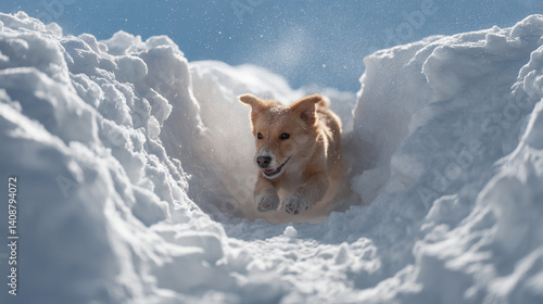 Dog playing in snow winter wonderland happy pet running through snowdrift cute canine outdoor adventure