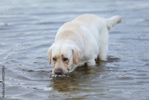 Dog playing in the water. Labrador retriever playing on the beach