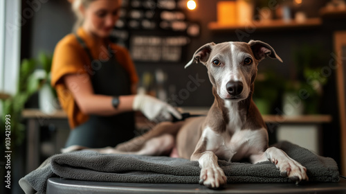 Dog receiving grooming treatment in a cozy salon