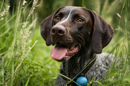 Dog Training Clicker. Obedience Education for German Pointer in Summer Grass
