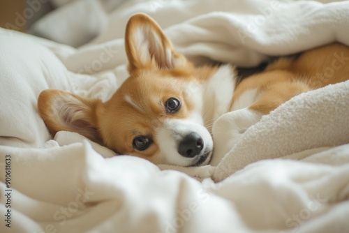 Dog wrapped in cozy blanket, adorable Welsh Corgi lying on white bedding, cute pet resting, indoors, relaxation, domestic animal comfort concept