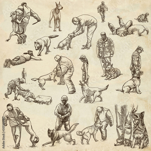 Dogs - dog training. Collection, pack of freehand sketches. Line art on old paper.