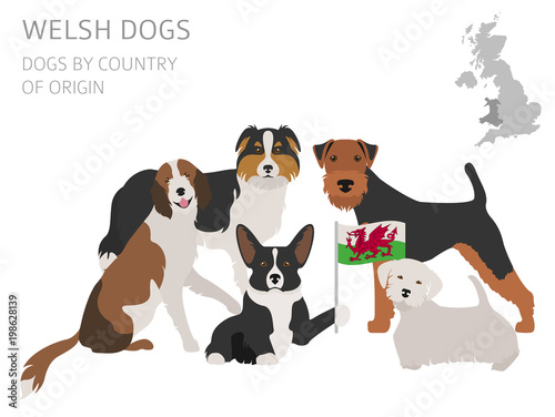 Dogs by country of origin. Walsh dog breeds. Infographic template