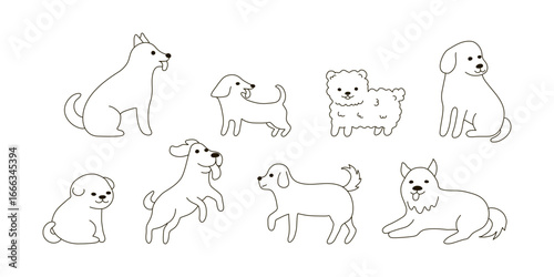 Dogs character pet in different poses doodle line set. Cartoon dog animal collection. Funny happy pet animals. Vector illustration isolated on white background