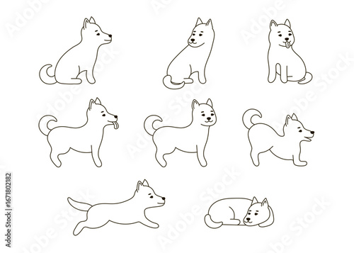 Dogs character pet in different poses doodle line set. Cartoon dog animal collection. Funny happy pet animals. Vector illustration isolated on white background