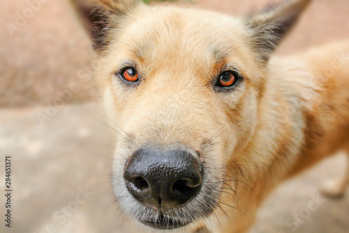 Dog's eyes full of questions and want to fight. He's also a man's best friend too.