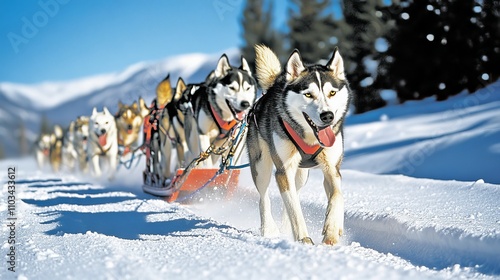 Dogsledding Adventure Huskies pull sled across a snowy mountain landscape on a sunny winter day