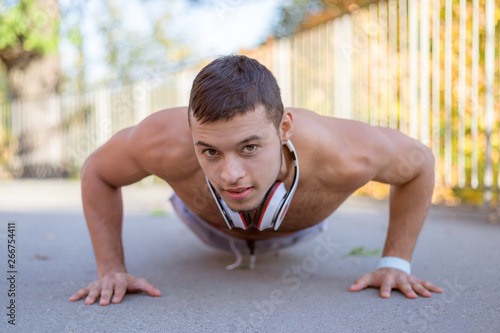 Doing push-ups pushups exercising sports training fitness workout young latin man