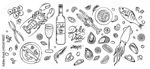 Dolce Vita seafood vector set. Hand-drawn fish, shrimp, squid, oysters, herbs, lemon, and wine. Perfect for Mediterranean menus, cookbooks, and food packaging.