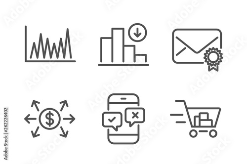 Dollar exchange, Decreasing graph and Verified mail icons simple set. Phone survey, Line graph and Shopping cart signs. Payment, Crisis chart. Business set. Line dollar exchange icon. Editable stroke