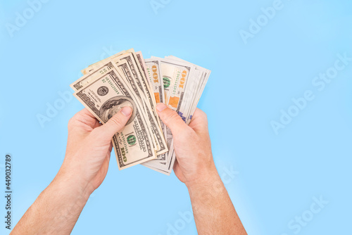dollars in male hands on a blue