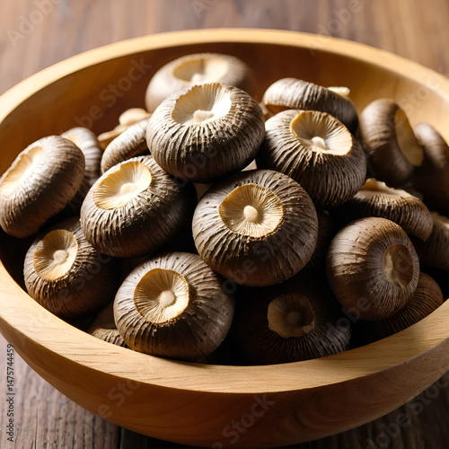 Dolly to right closeup of fresh shiitake mushrooms in wood bowl.