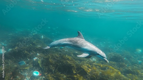 Dolphin swimming underwater through seaweed and plastic in ocean with sunlight shining through