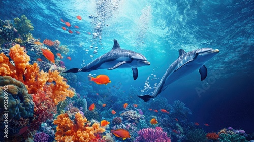 Dolphins exploring the vibrant coral reef, with fish and sea plants adding to the diversity of the underwater world.