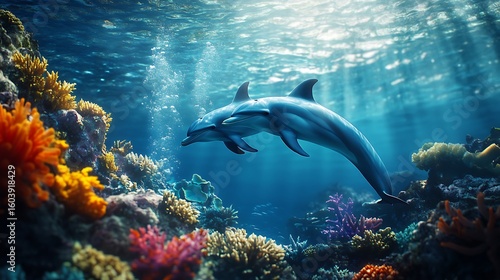 Dolphins swimming above colorful coral reef landscape high resolution picture