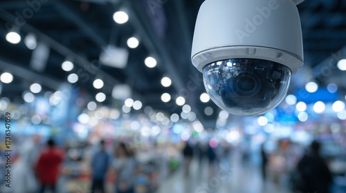 Dome surveillance camera gleaming under fluorescent lights, modern store interior blurred behind with customers moving softly in frame